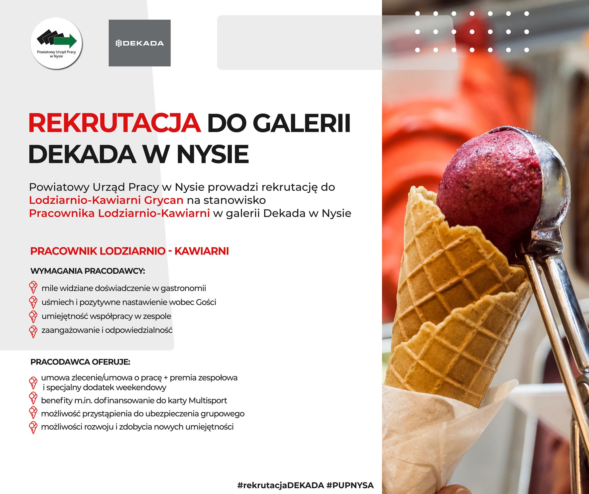Powiatowy Urząd Pracy w Nysie prowadzi rekrutację do Lodziarnio-Kawiarni Grycan , która zajmuje się sprzedażą lodów i deserów. Grycan-Lody to uznana marka, która od 2004 r. z sukcesem rozwija sieć punktów sprzedaży na rynku polskim.