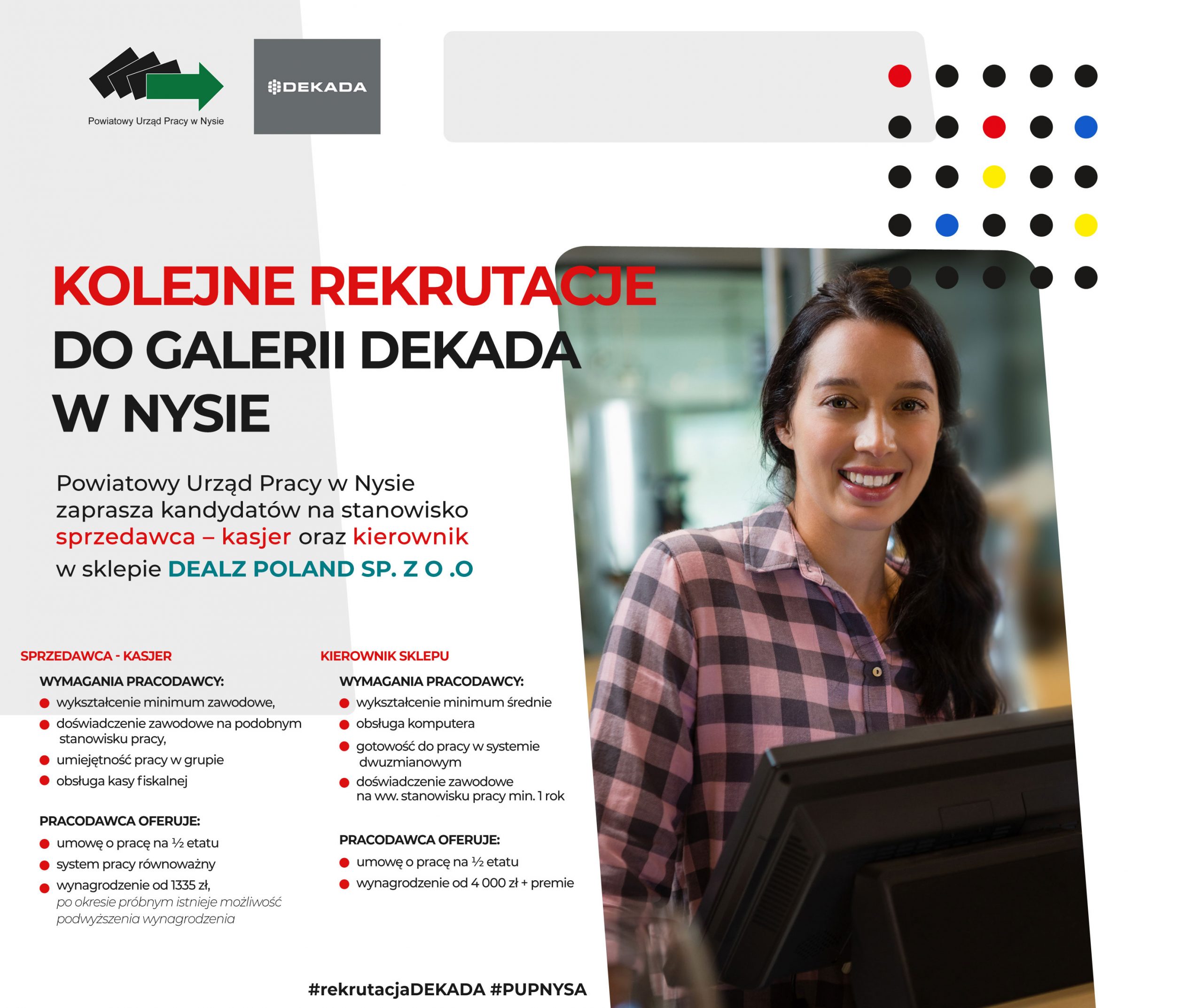 Powiatowy Urząd Pracy w Nysie prowadzi rekrutację do galerii Dekada w Nysie na stanowiska sprzedawcy – kasjera oraz kierownika w sklepie DEALZ POLAND SP. Z O .O.