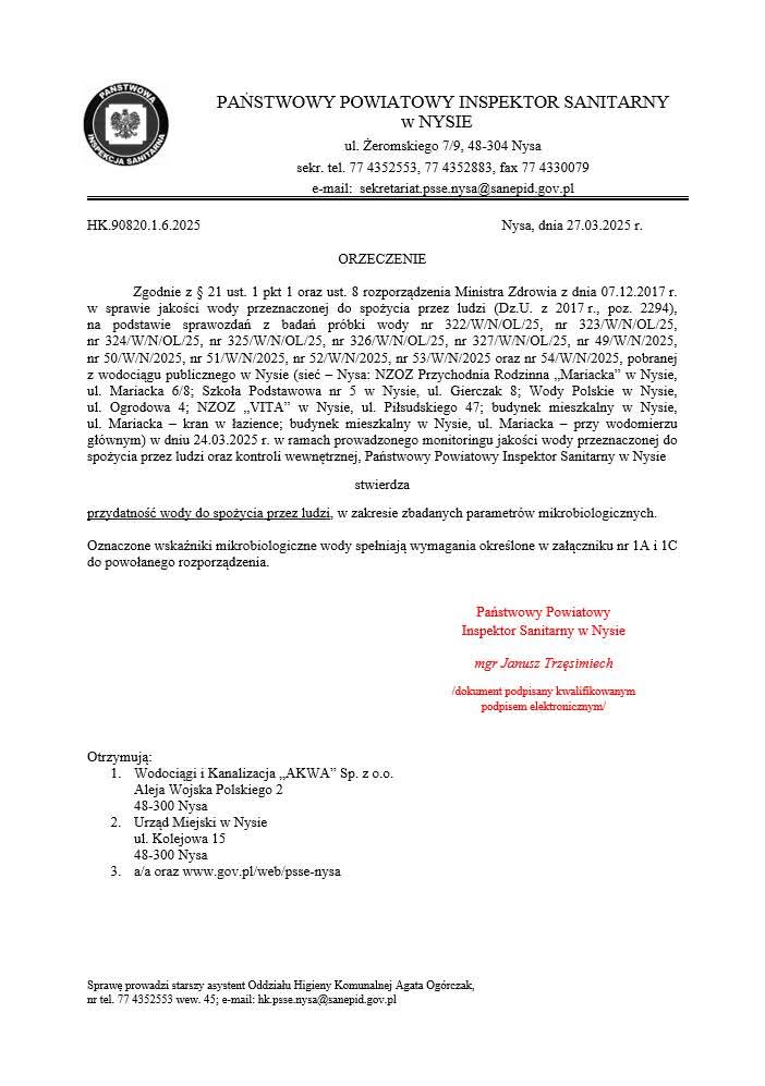 W dniu 24.03.2025 r. upoważnieni pracownicy Powiatowej Stacji Sanitarno-Epidemiologicznej w Nysie oraz przedstawiciel (próbkobiorca) Wodociągów i Kanalizacji „AKWA” sp. z o.o. z s. w Nysie pobrali równocześnie po 6 (sześć) próbek wody do badań mikrobiologicznych pochodzącej z wodociągu publicznego w Nysie, w tym po 1 (jednej) próbce w lokalu mieszkalnym przy ul. Mariackiej w Nysie, w którym jakość wody była kwestionowana, oraz po 1 (jednej) próbce wody przy wodomierzu głównym w budynku przy ul. Mariackiej w Nysie. Pozostałe 8 (osiem) próbek pobrano po 4 (cztery) przez każdy z ww. podmiotów w stałych, wyznaczonych punktach poboru próbek wody w mieście Nysa (punkty zgodności). Próbki pobrane przez pracowników Powiatowej Stacji Sanitarno-Epidemiologicznej w Nysie zostały przekazane do badań mikrobiologicznych do Działu Laboratoryjnego Wojewódzkiej Stacji Sanitarno-Epidemiologicznej w Opolu.