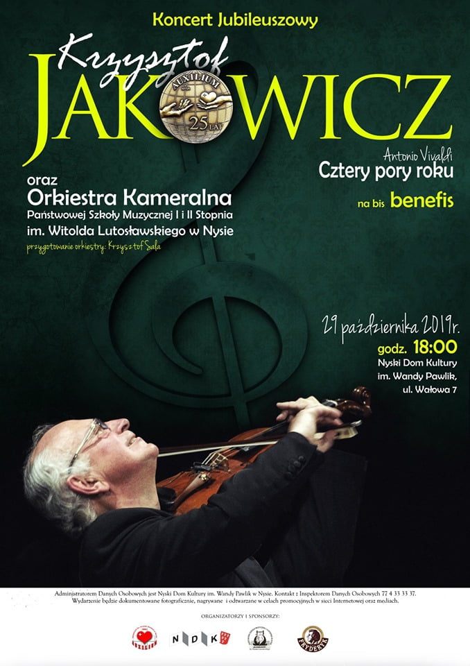 Bilety dostępne w kasie Nyskim Domu Kultury oraz serwisach: https://link.do/biletyndknysaBilety: parter – 80zł, balkon – 60złKrzysztof Jakowicz – Wybitny polski skrzypek, szczególnie ceniony przez Witolda Lutosławskiego, któremu wielki kompozytor powierzył polskie prawykonanie wszystkich swoich utworów skrzypcowych (Łańcuch II, Partita w wersji z orkiestrą, Subito – ostatnie dzieło mistrza). Na zaproszenie Lutosławskiego, wykonywał dzieła kompozytora pod jego batutą w ważnych centrach muzycznych świata.