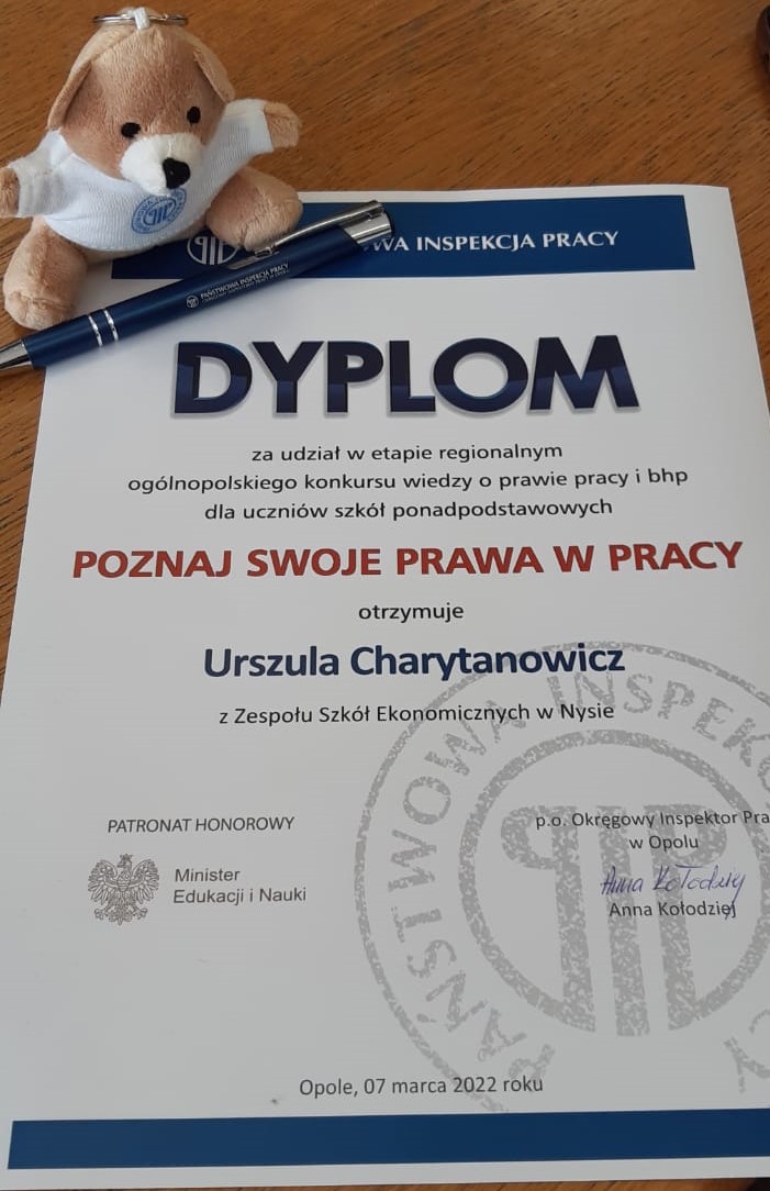 Konkurs wojewódzki „Poznaj swoje prawa w pracy” 1 msc. uczennicy z Ekonomika