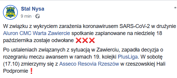 W dniu 18 października Stal Nysa miała się zmierzyć w Hali przy ulicy Sudeckiej z drużyną z Zawiercia. Jak się okazuje koronawirus pokrzyżował te plany i wymusił zmiany.