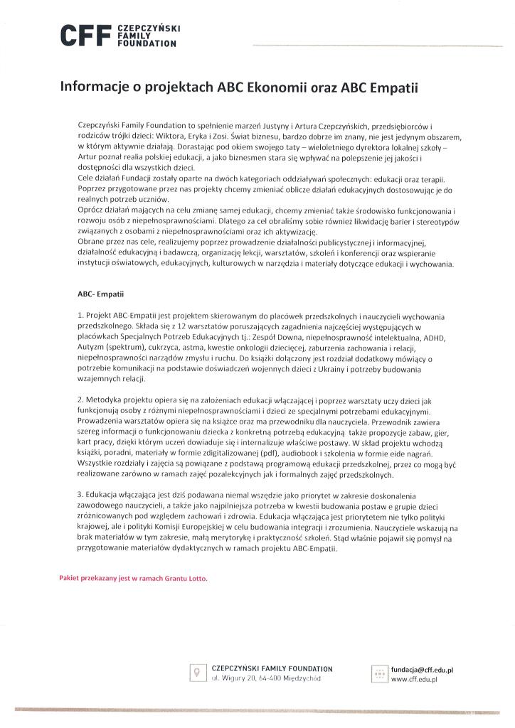 Otrzymane książki ABC Emocji (edukacja zdrowotna), ABC Empatii (edukacja włączająca) kierowane są zgodnie z obowiązującą podstawą programową dla dzieci od 5 do 10 roku życia.