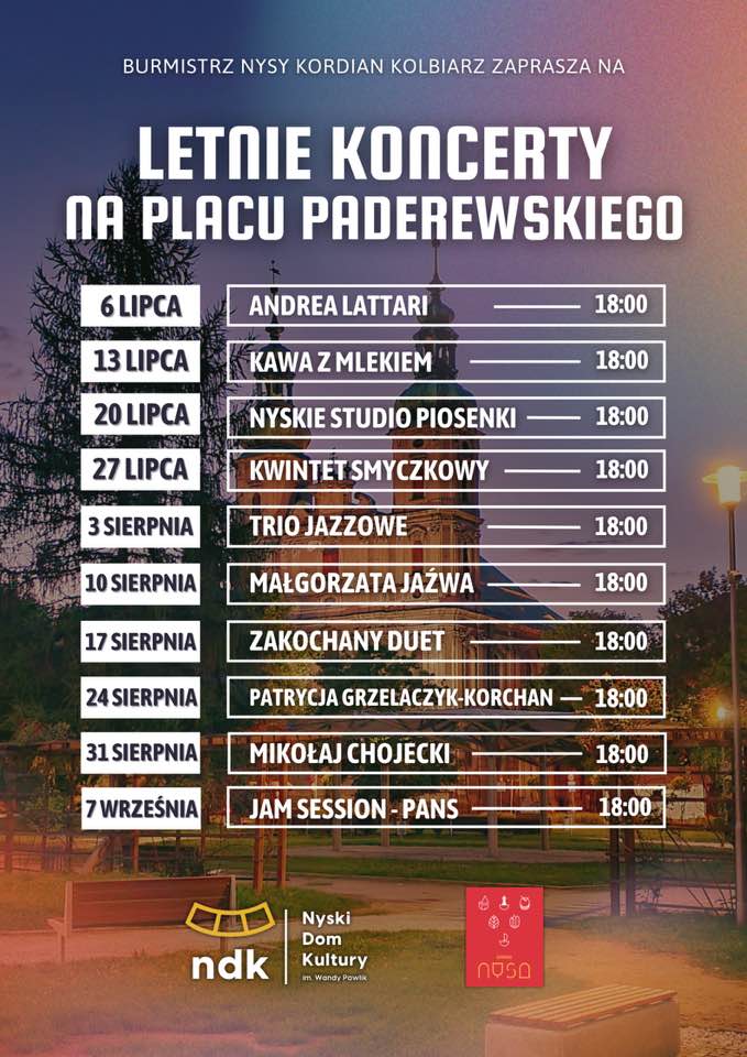 Nyski Dom Kultury zaprasza na wyjątkowe muzyczne wieczory. Przez całe wakacje, w każdą niedzielę o 18:00, Plac Paderewskiego wypełni się dźwiękami muzyki na żywo. Czekają na Was różnorodne koncerty, lokalni artyści i świetna atmosfera pod gołym niebem – informuje Nyski Dom Kultury.