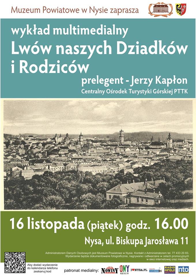 W dniu 16 listopada w Muzeum Powiatowym w Nysie będzie miała miejsce prezentacja “Lwów naszych Dziadków i Rodziców. Początek o godzinie 16. Prelegentem jest Jerzy Kapłon, dyrektor Centralnego Ośrodka Turystyki Górskiej PTTK w Krakowie.