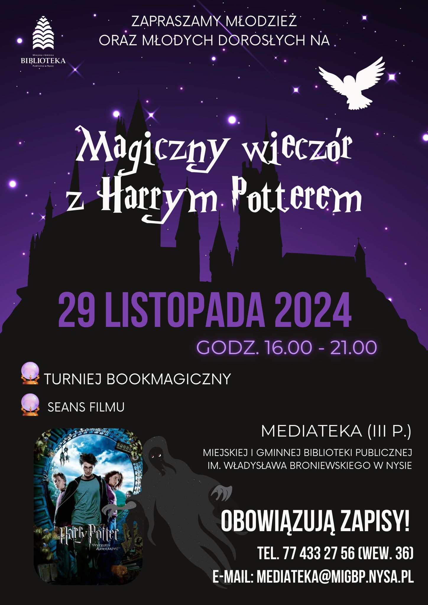 W Miejskiej i Gminnej Bibliotece Publicznej w Nysie ponownie zagości magia ze świata Harrego Pottera. Biblioteka zaprasza młodzież i młodych dorosłych na Magiczny wieczór z Harrym Potterem 29 listopada (piątek) o godz. 16.00 w Mediatece (III piętro).