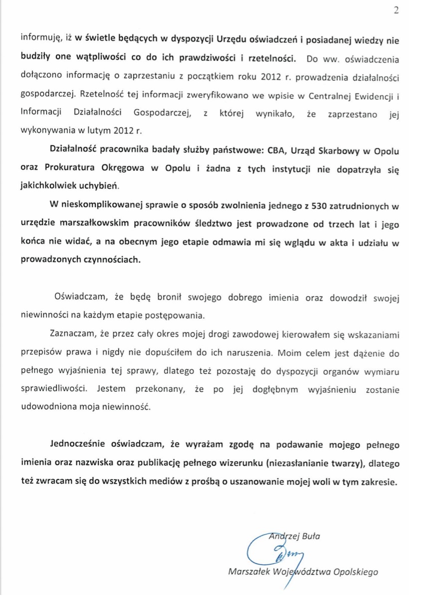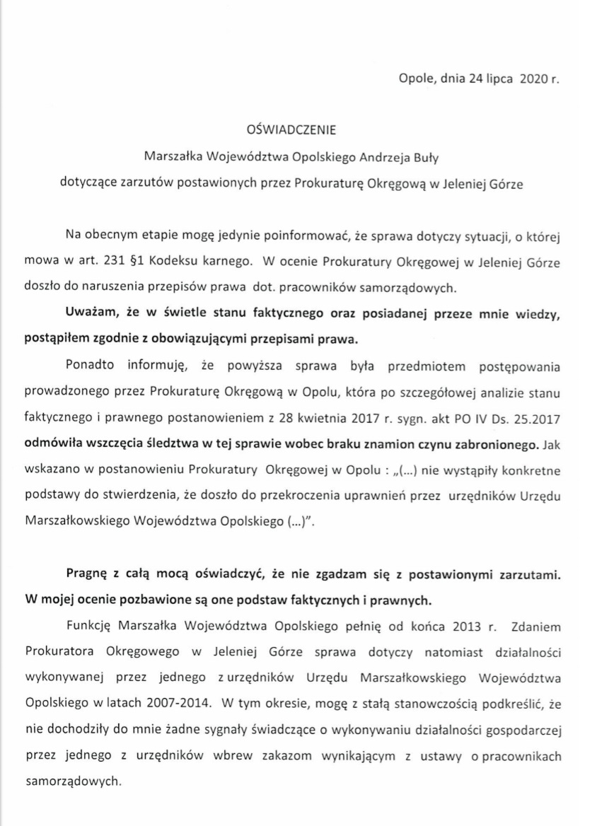 Będąc marszałkiem województwa opolskiego, nie dopełnił obowiązków służbowych, pomimo stwierdzenia naruszenia przepisów ustawy o pracownikach samorządowych oraz poświadczenia nieprawdy w oświadczeniach majątkowych przez podległego mu pracownika – prok. Krzysztof Świątek z Prokuratury Okręgowej w Jeleniej Górze, dla portalu Onet.pl