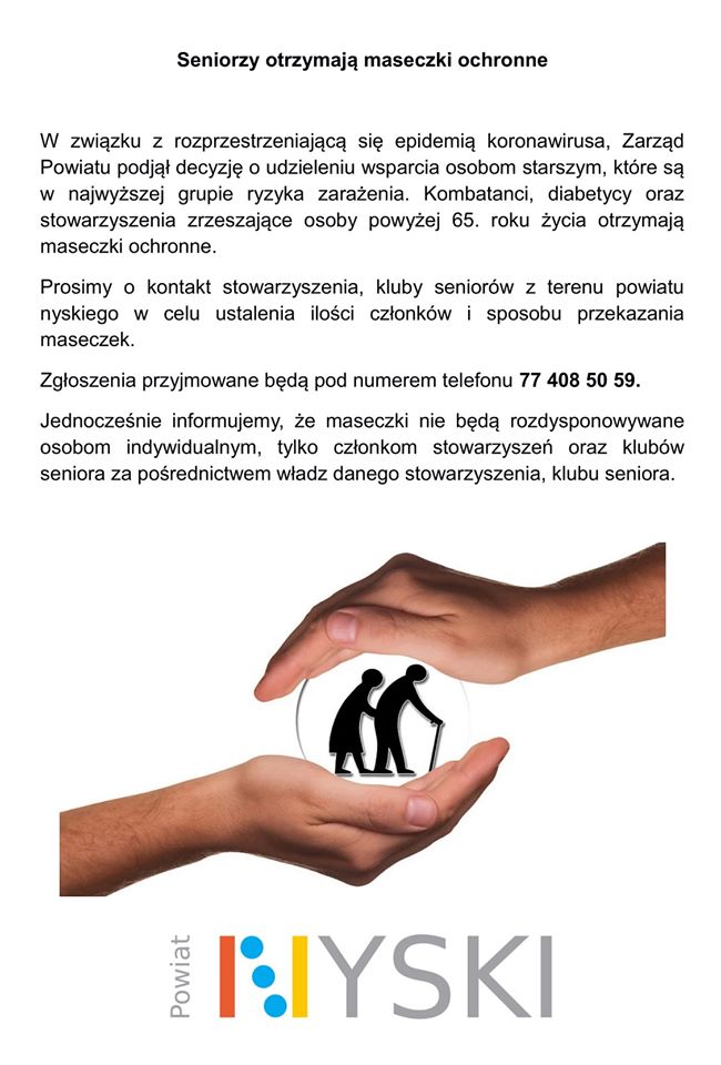 Seniorzy otrzymają maseczki ochronne. Jest to spowodowane rozprzestrzenianiem się koronawirusa. Zarząd Powiatu podjął decyzję o udzieleniu wsparcia osobom starszym. Co ważne – maseczki nie będą rozdzielane indywidualnie ale poprzez poprzez kluby seniora oraz stowarzyszenie do których należą te osoby.