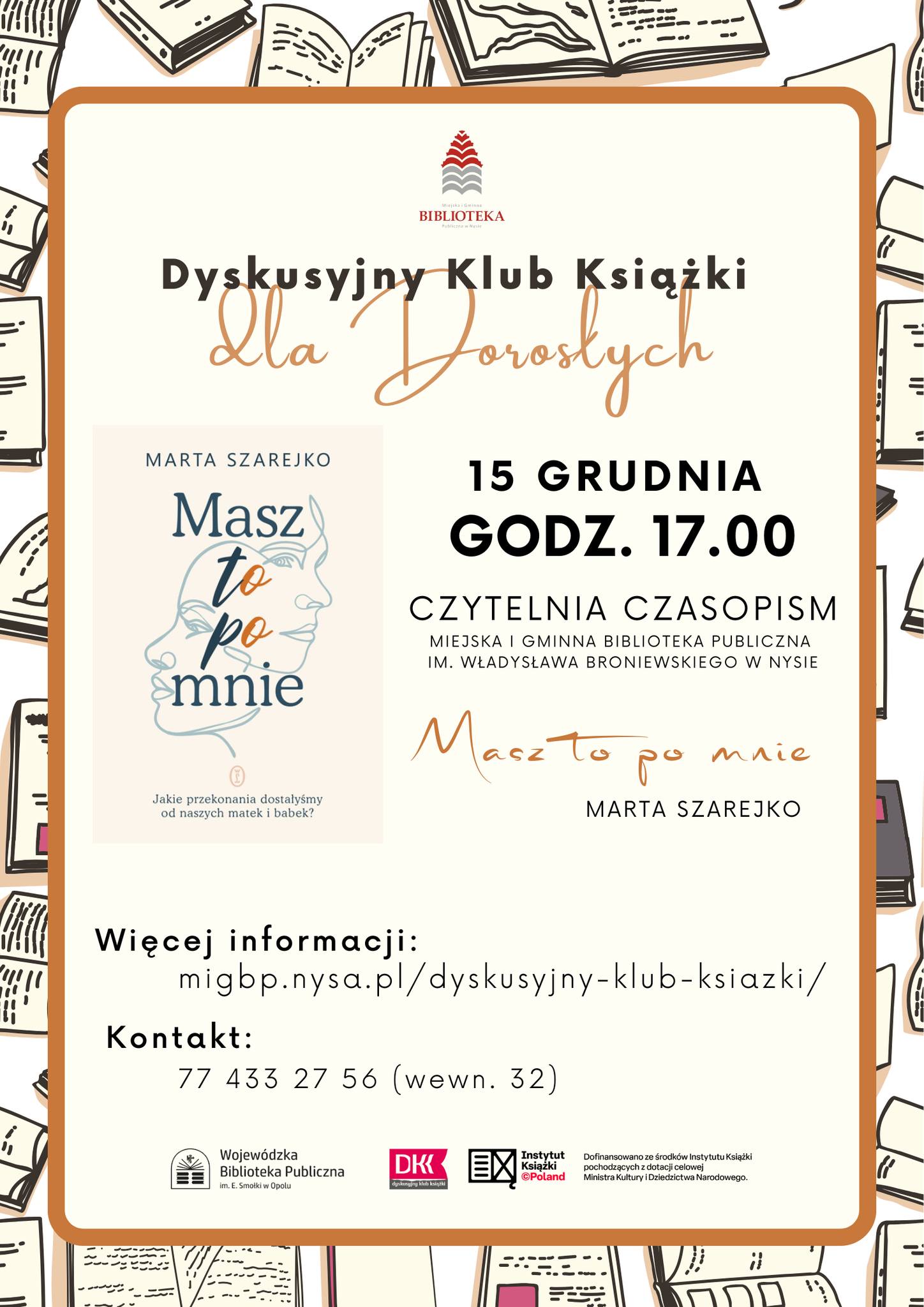 Miejska i Gminna Biblioteka Publiczna w Nysie zaprasza na spotkanie Dyskusyjnego Klubu Książki dla Dorosłych, które odbędzie się 15 grudnia (poniedziałek) o godz. 17.00 w Czytelni Czasopism.