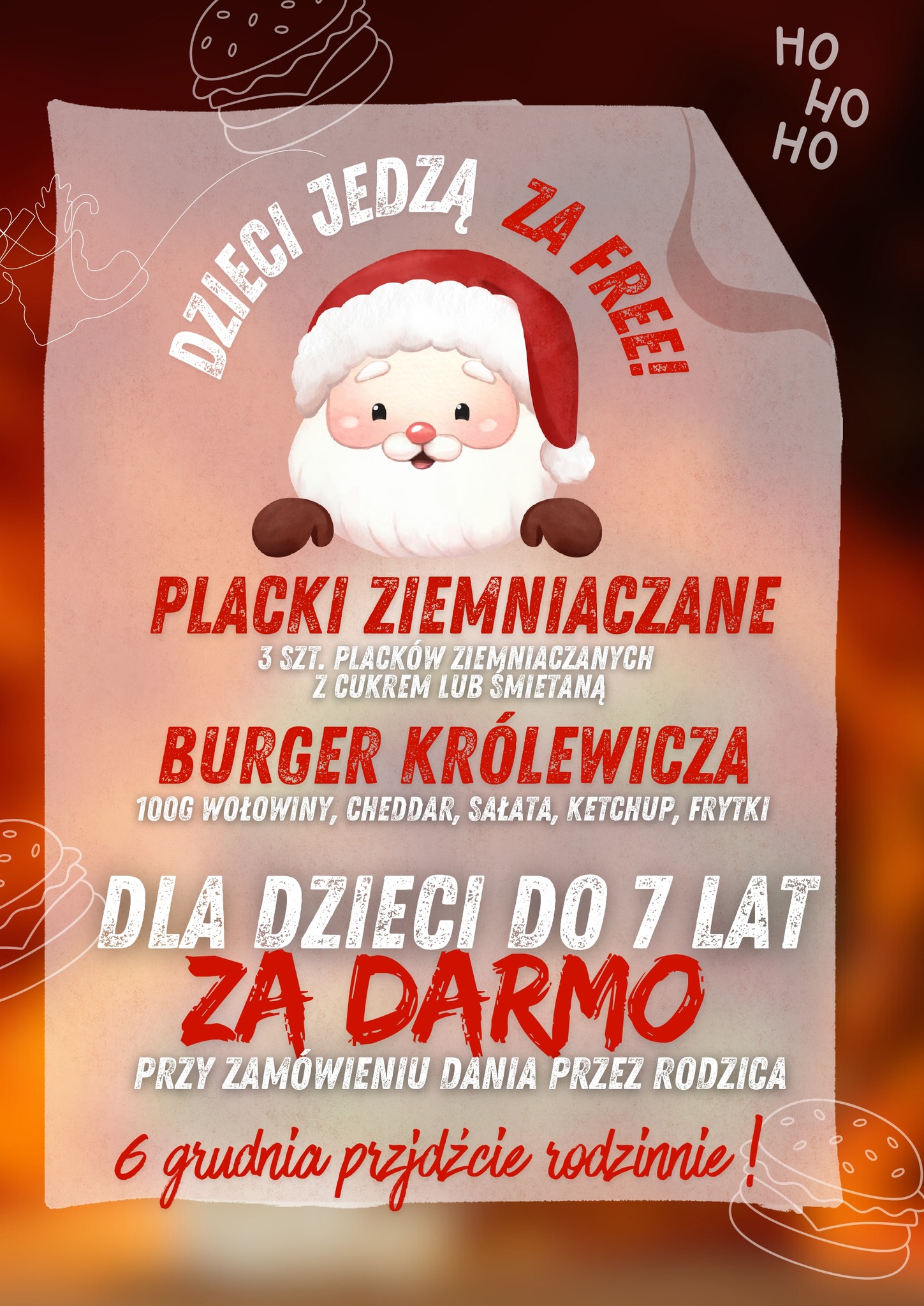Przy zamówieniu dania przez rodzica, najmłodsi otrzymują posiłek gratis – do wyboru placki ziemniaczane lub Burger Królewicza.