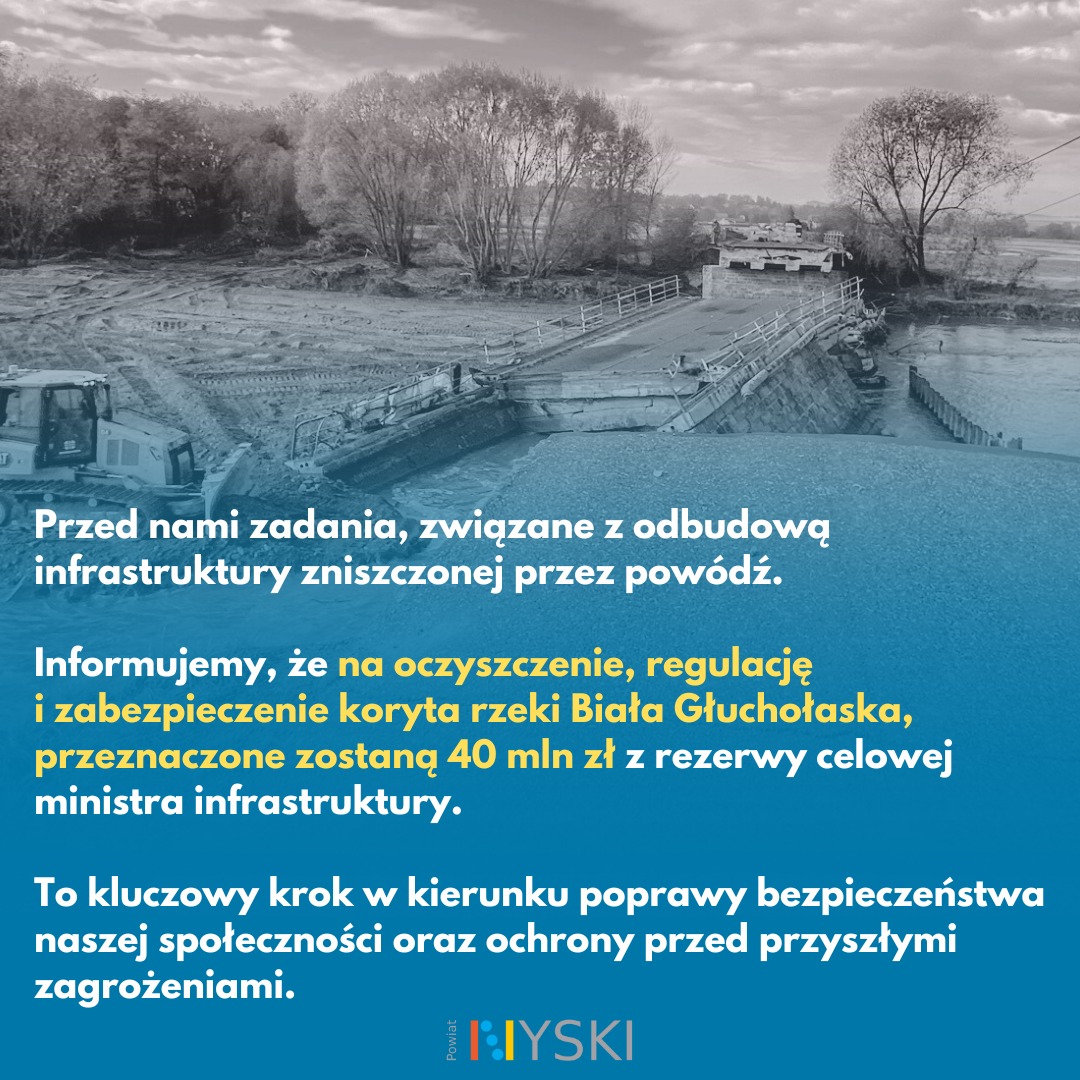 Informujemy, że na oczyszczenie, regulację i zabezpieczenie koryta rzeki Biała Głuchołaska, przeznaczone zostaną 40 mln zł z rezerwy celowej ministra infrastruktury.