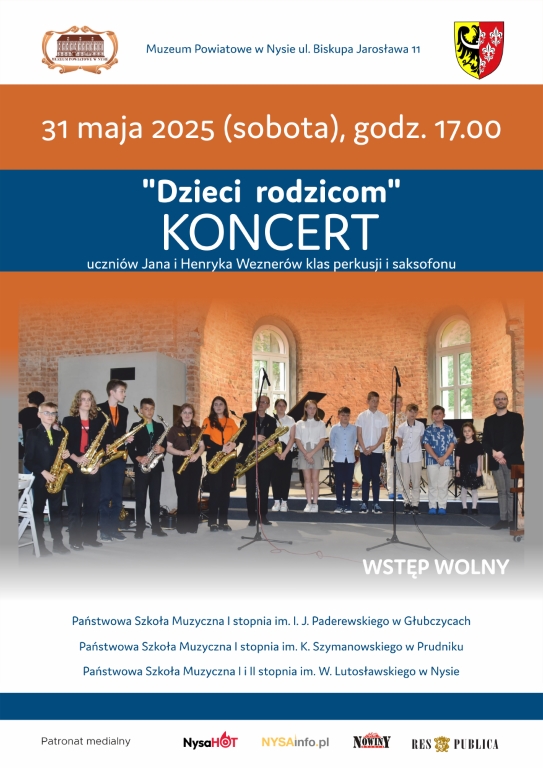 Koncert „Dzieci rodzicom” – muzyczna uczta pełna emocji! Muzeum Powiatowe w Nysie serdecznie zaprasza na wyjątkowy koncert uczniów klas perkusji i saksofonu Jana i Henryka Weznerów który odbędzie się 31 maja 2025 r. (sobota) o godzinie 17.00.