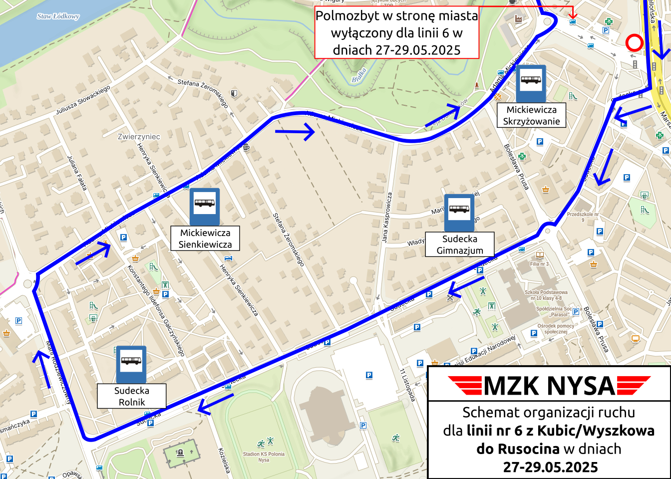 Jak informuje Miejski Zakład Komunikacji w Nysie – w najbliższych dniach pasażerowie linii nr 6 będą podróżować zmienioną trasą. z powodu prac, które będą prowadzone w dniach 27-29.05.2025 na zjeździe z ul. Jagiellońskiej w ul. Piłsudskiego nie będzie możliwy wjazd na przystanek Piłsudskiego Polmozbyt dla linii nr 6 dla autobusów jadących od strony Kubic/Wyszkowa w stronę Rusocina.