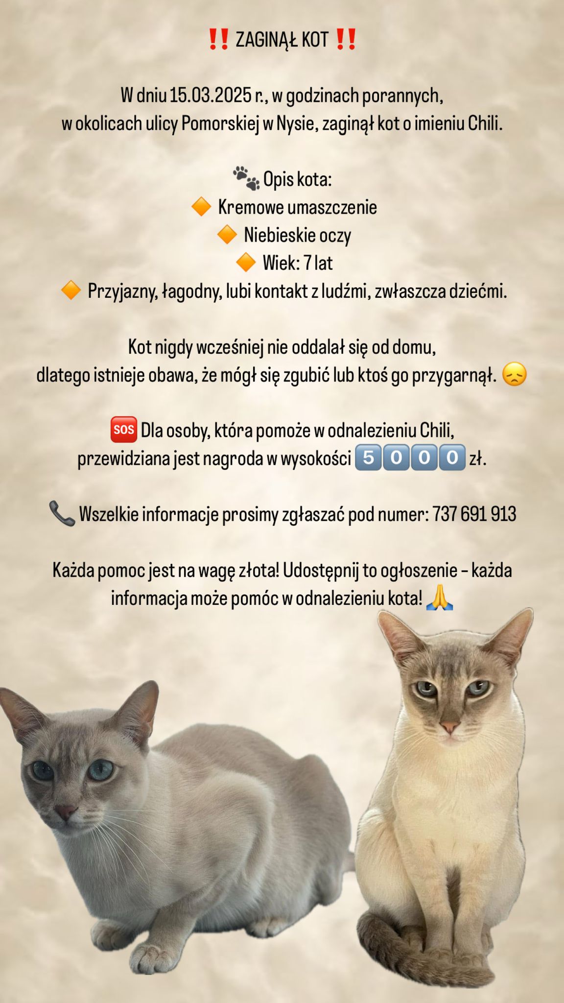 Zaginął kot. W dniu 15 marca w godzinach porannych w okolicach ulicy Pomorskiej w Nysie, zaginął kot o imieniu Chili. Właściciele proszą o pomoc.