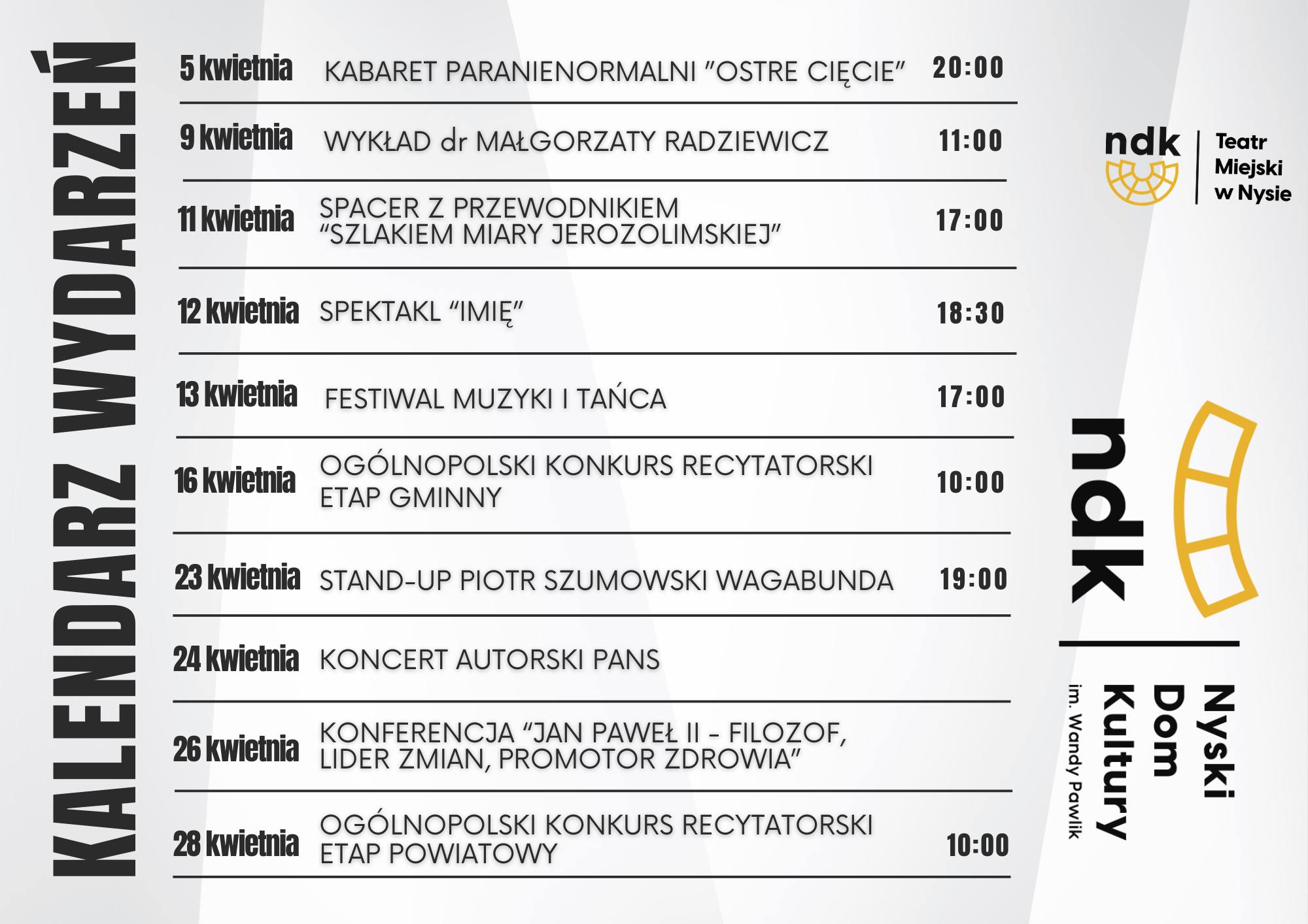 Nyski Dom Kultury przygotował zestawienie wydarzeń, które będą miały miejsce w kwietniu. Wśród wydarzeń zaplanowano między innymi występ Kabaretu Paraniermalni czy spacer z przewodnikiem.