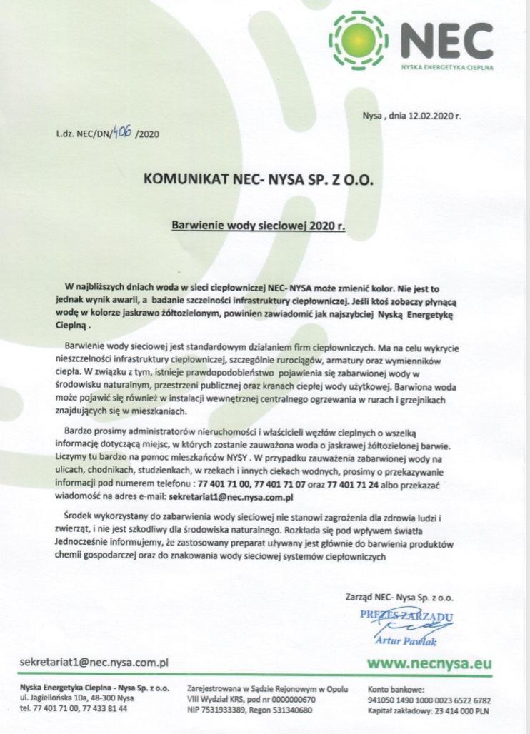 Jak w komunikacie prasowym wyjaśnia gminna spółka jest spowodowanie badaniem szczelności sieci ciepłowniczej. W przypadku nieszczelności instalacji należy skontaktować się z Nyską Energetyką Cieplną: 77 401 71 00, 77 401 71 07, 77 401 71 24.