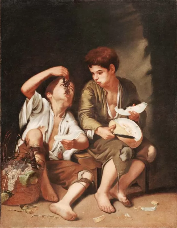Wystawa dwóch obrazów z kolekcji prywatnej stanowi zderzenie dwóch odrębnych tradycji malarskich: hiszpańskiej i flamandzkiej. Przedstawicielem pierwszej z nich jest jeden z najsłynniejszych artystów europejskich, sewilski malarz doby baroku – Bartolomé Estéban Murillo (1617-1682) wraz z warsztatem. Obraz „Chłopcy z melonem i winogronami” (ok. 1650 r.) jest znakomitym przykładem dzieł poruszających tematykę rodzajową. Murillo znany jest przede wszystkim z przedstawień religijnych, w szczególności pełnych słodyczy i wdzięku wizerunków „Immaculaty” (Niepokalanej). Dzieło prezentowane na wystawie stanowi ilustrację dramatycznego zjawiska, jakim było pojawienie się na ulicach Sevilli wielu przymierających głodem dzieci, osieroconych na skutek epidemii dżumy, która nawiedziła miasto w 1649 roku. Ukazuje dwóch ubogo odzianych chłopców, którzy z braku środków na zakup drogiej wówczas wody, zaspokajają pragnienie dzięki soczystym owocom, jakie udało im się zdobyć.