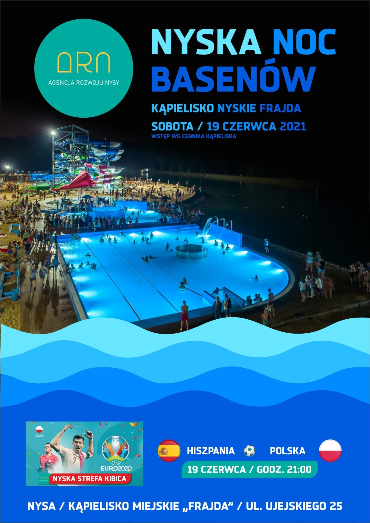 O godz. 19:00 DJ MAJER rozpocznie muzyczną ucztę, dla spragnionych promieni słońca i basenowej ochłody. O godz. 21:00 w Nyskiej Strefie Kibica na boisku ze sztuczną nawierzchnią będziemy mogli obejrzeć na dużym telebimie mecz EURO 2020: POLSKA – HISZPANIA. Nie zabraknie smacznego jedzenia, zimnych napojów i niespodzianek skierowanych do najmłodszych.