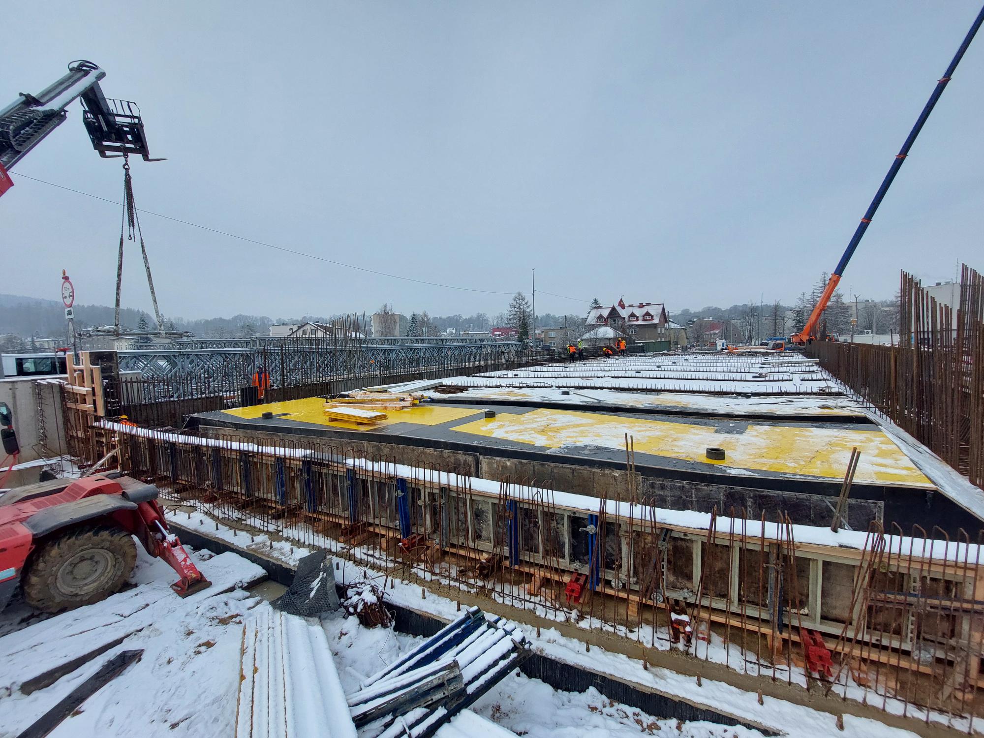 Po zakończeniu budowy podpór tymczasowych w nurcie rzeki – co jest niezbędne przy moście o tak dużej rozpiętości i masie – trwa deskowanie oraz prace zbrojarskie ustroju nośnego. W kolejnym etapie zaplanowane jest jego betonowanie. Roboty związane z budową konstrukcji mostu zakończymy w połowie br., po czym zdemontujemy podpory tymczasowe. Po wykonaniu dojazdów do obiektu, próbnych obciążeń i otrzymaniu pozwolenia na użytkowanie, nowy most planujemy udostępnić kierowcom w drugiej połowie 2026 roku.