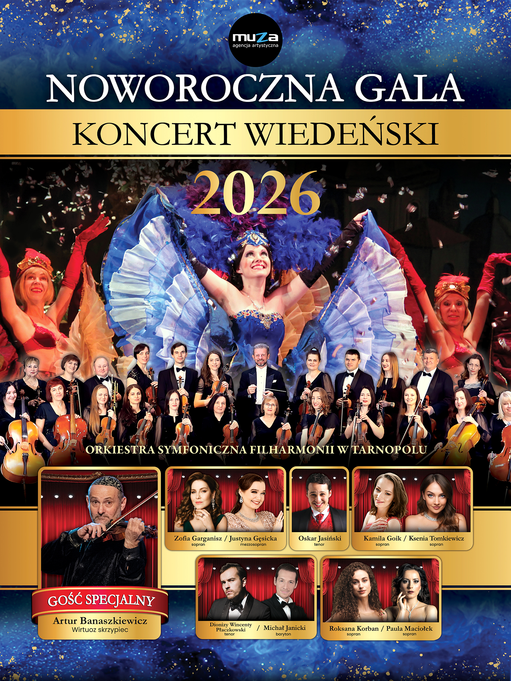 Tegoroczna edycja NOWOROCZNEJ GALI zostanie uroczyście poprowadzona przez Oskara Jasińskiego (tenor), który da również popis swoich umiejętności wokalnych w utworach solowych jak i wspaniałych duetach. Ponadto na scenie wystąpią wybitni Artyści: Zofia Garganisz (sopran) / Justyna Gęsicka (mezzosopran), Kamila Goik (sopran) / Ksenia Tomkiewicz (sopran), Roksana Korban (sopran) / Paula Maciołek (sopran) oraz Dionizy Wincenty Płaczkowski (tenor) / Michał Janicki (baryton).