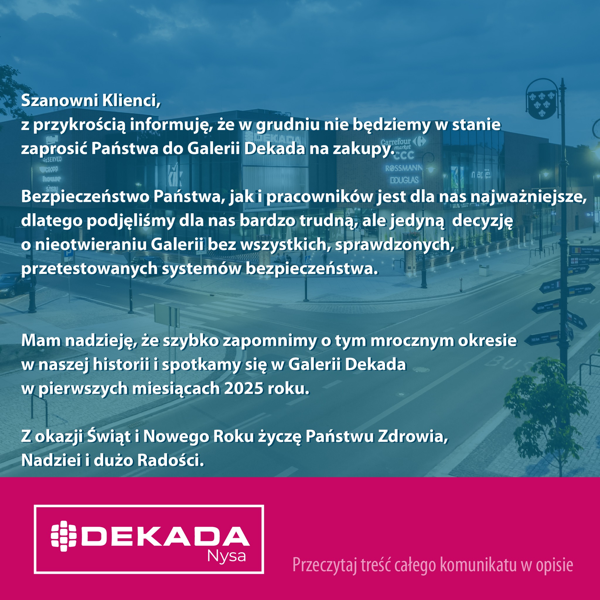 Z przykrością informuję, że w grudniu nie będziemy w stanie zaprosić Państwa do Galerii Dekada na zakupy. Bezpieczeństwo Państwa jak i pracowników jest dla nas najważniejsze, dlatego podjęliśmy dla nas bardzo trudną, ale jedyną decyzję o nieotwieraniu Galerii bez wszystkich, sprawdzonych, przetestowanych systemów bezpieczeństwa.