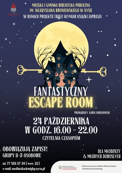 24 października w godz. 16.00-22.00 w Czytelni Czasopism, w ramach projektu Trzeci Wymiar Biblioteki, odbędzie się Fantastyczny Escape Room