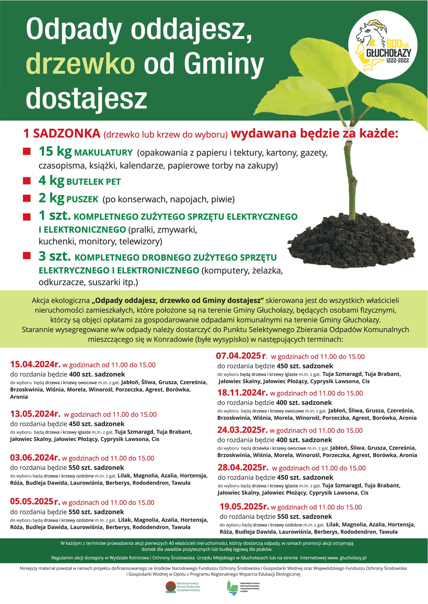 Już 28 kwietnia i 5 maja Głuchołazy zapraszają na kolejną odsłonę akcji ekologicznej „Odpady oddajesz, drzewko od Gminy dostajesz”! Ponownie mieszkańcy w zamian za odpady będą mogli otrzymać rośliny.