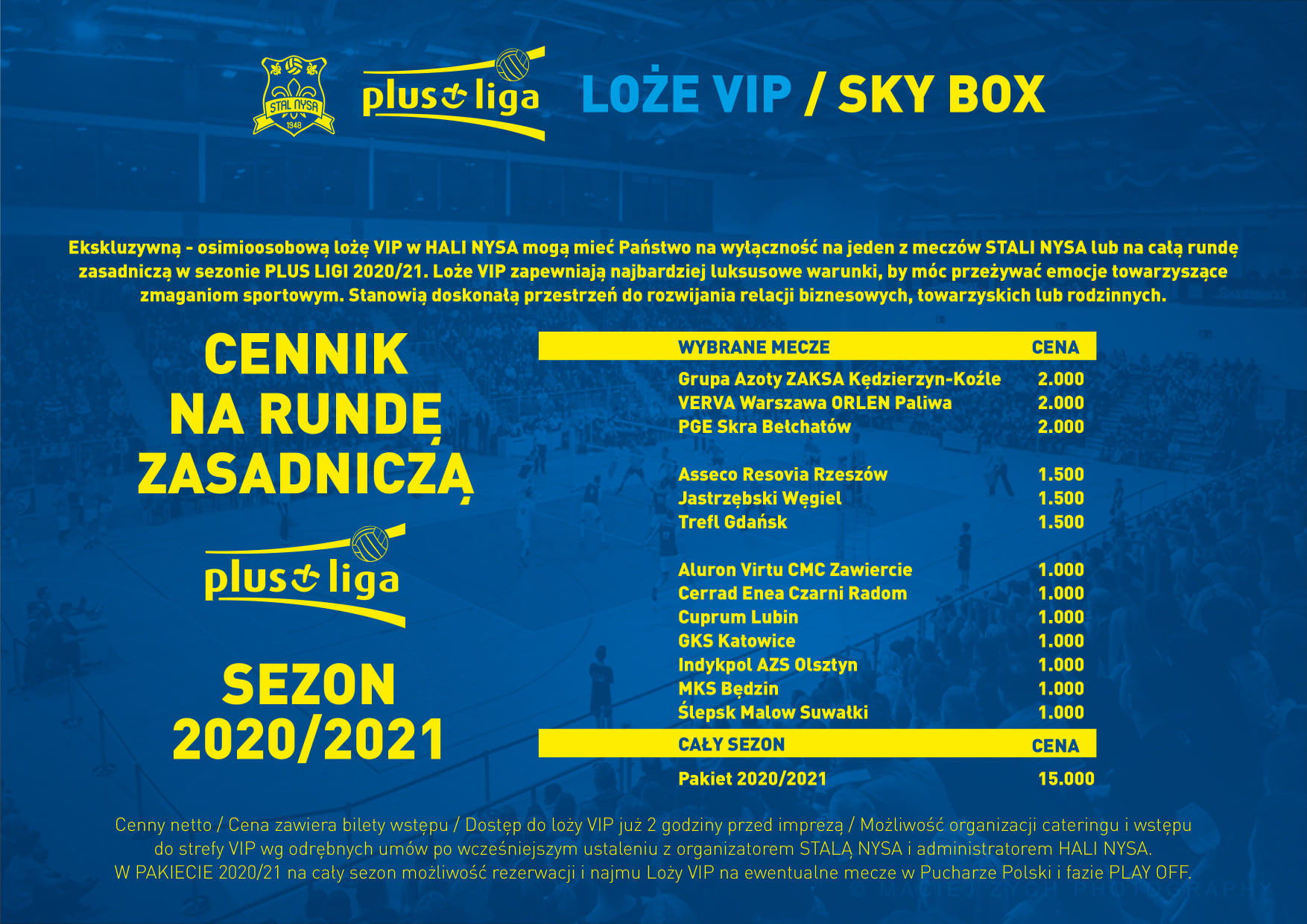 W związku ze zbliżającym się meczem STALI NYSA z Grupą Azoty ZAKSA Kędzierzyn-Koźle, który odbędzie się 11.09.2020r. o godzinie 17:00, pragniemy zaprezentować Państwu atrakcyjną ofertę, polegającą na wynajęciu ekskluzywnej, ośmioosobowej loży VIP SKY BOX w HALI NYSA. Oferta obejmuje również całą rundę zasadniczą w sezonie PLUS LIGA 2020/2021. Oferta uwzględnia również catering, wg odrębnej wyceny na podstawie wcześniej dostarczonego menu – Hala Nysa.
