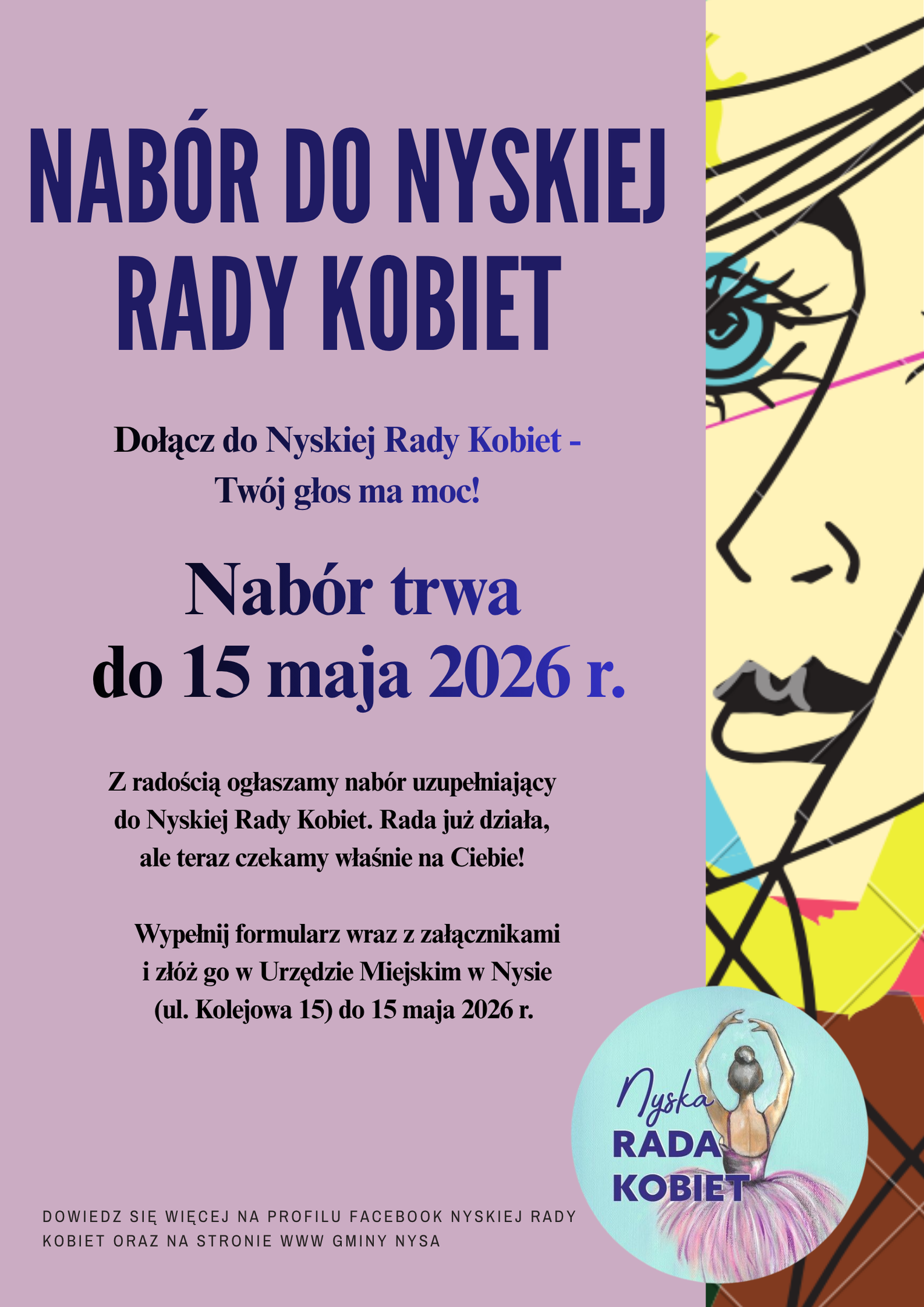 Na podstawie § 7 ust. 3 Regulaminu Pracy Rady Kobiet w Nysie, uchwalonego w dniu 22 maja 2025 r. Uchwałą nr 1/2025 Rada Kobiet w Nysie ogłasza nabór otwarty kandydatek do Rady.