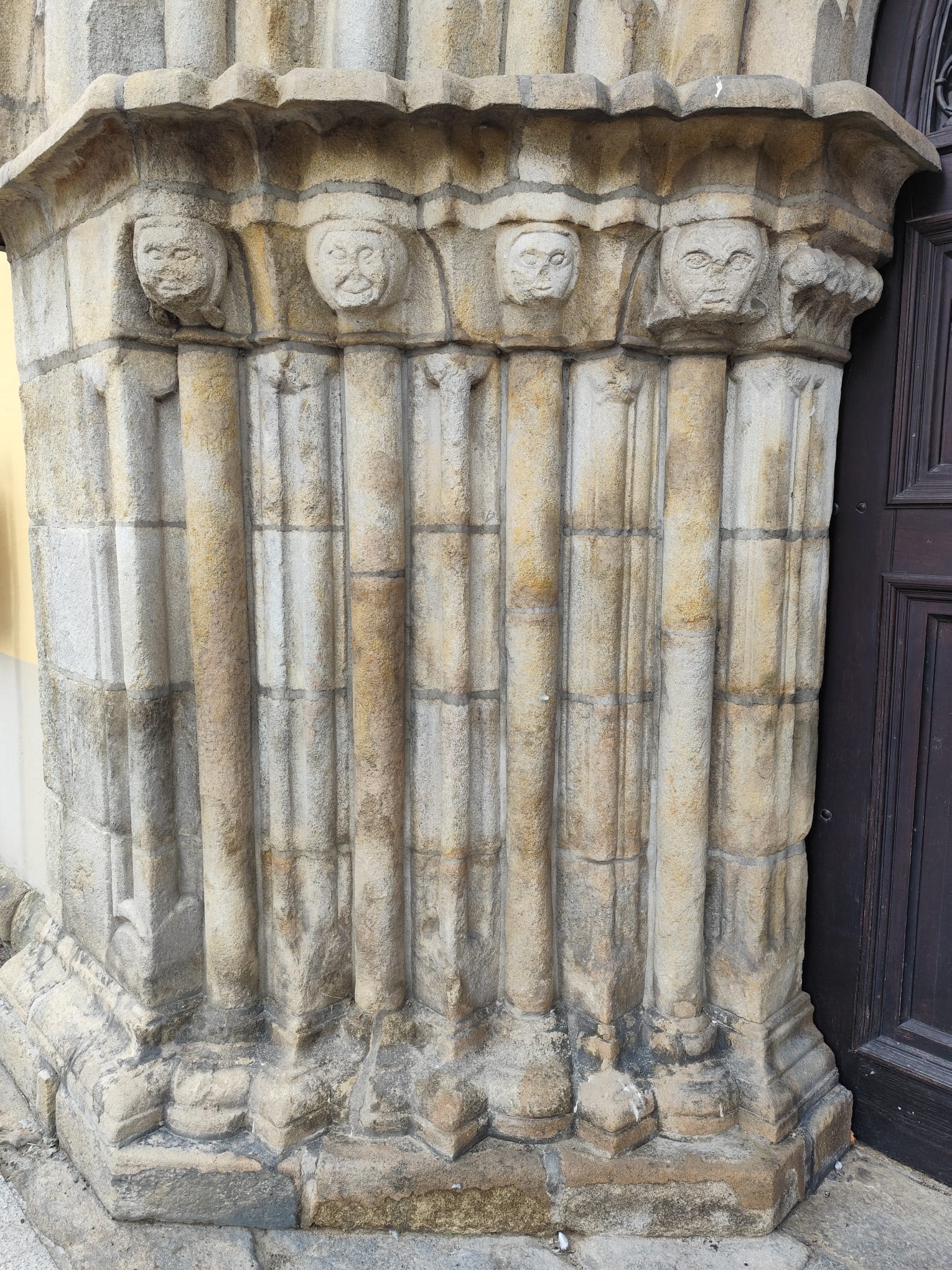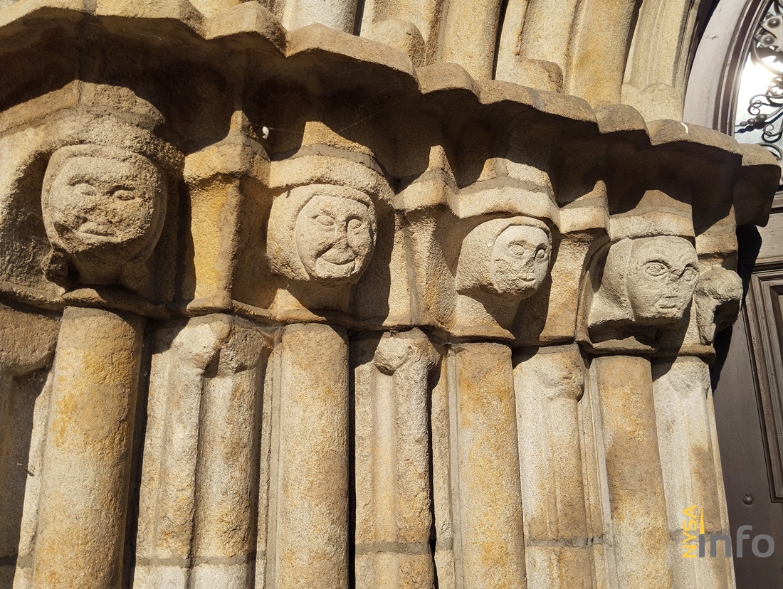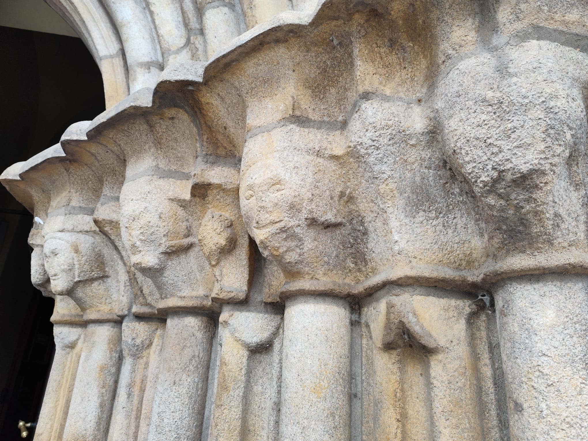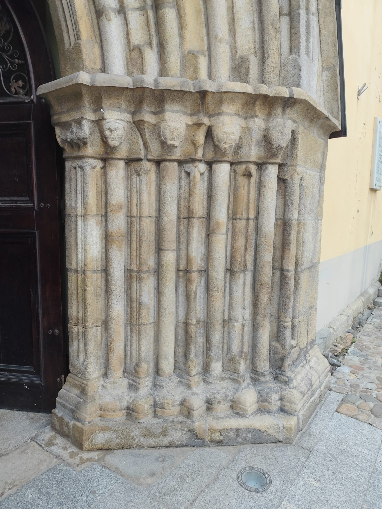 Detale są skromne, bez rozbudowanej ornamentyki – typowe dla surowej architektury sakralnej XIII wieku. Portal ma cechy romańsko-gotyckie, jest uskokowy, z ostrołukową, profilowaną archiwoltą, a jego kolumny w ościeżach zwieńczono głowicami z maskami, prawdopodobnie przedstawiającymi twarze zakonników. Dziś część twarzy jest zatarta, ale na niektórych wciąż widać wyraźne rysy nadane przez nieznanego twórcę tego dzieła.