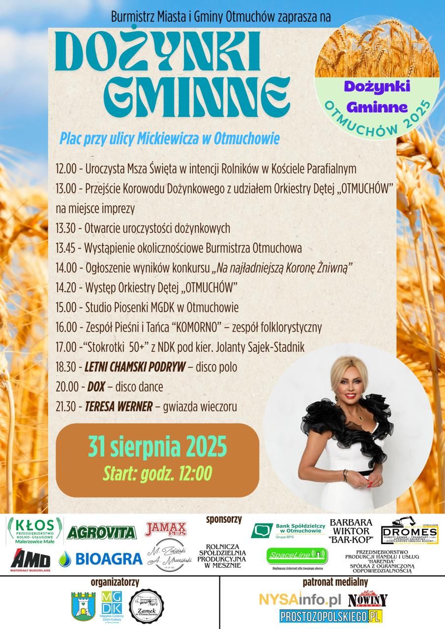 Burmistrz Miasta u Gminy Otmuchów zaprasza nd Dożynki Gminne. Święto plonów w Otmuchowie będzie miało miejsce już 31 sierpnia.