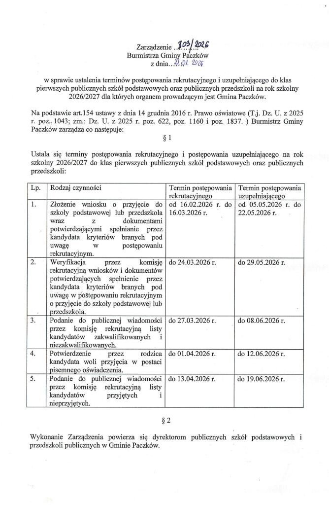 Szczegółowe zasady rekrutacji zostały określone w zarządzeniu Burmistrza Gminy Paczków nr 303/2026 z dnia 21 stycznia 2026 r. To dokument, który zawiera wszystkie niezbędne informacje dotyczące przebiegu rekrutacji.