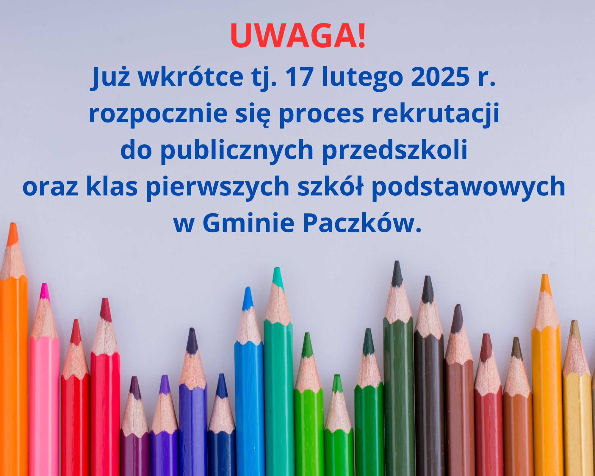 Uwaga rodzice: Rekrutacja do szkół i przedszkoli na rok szkolny 2025/2026 już wkrótce! Informujemy, że 17 lutego 2025 r. rozpocznie się proces rekrutacji do publicznych przedszkoli oraz klas pierwszych publicznych szkół podstawowych w Gminie Paczków na nadchodzący rok szkolny 2025/2026.