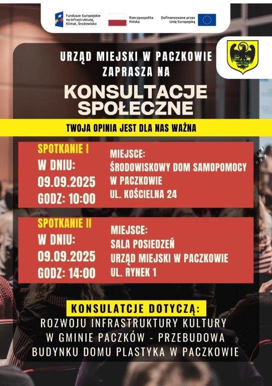 W dniach od 05.09.2025 r. do 12.09.2025 r. przeprowadzone zostaną konsultacje społeczne projektu obejmującego: przebudowę i dobudowę budynku Domu Plastyka w Paczkowie w celu realizacji działań kulturalnych, muzealnych, wystawienniczych, edukacyjnych i bibliotecznych.