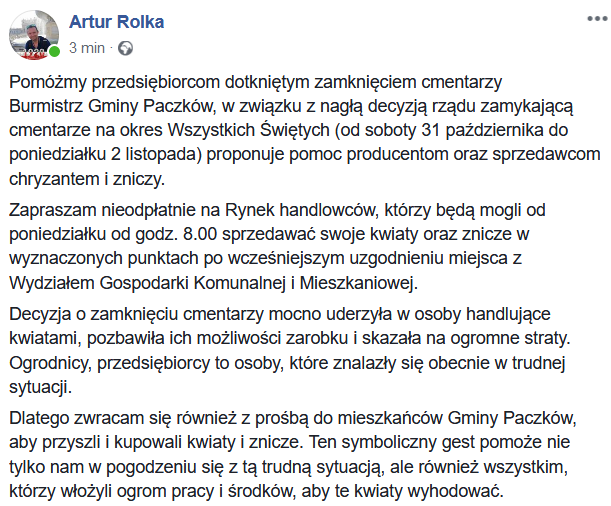 Władze państwowe co prawda zapowiedziały pomoc, jednak samorządowcy już na własną rękę również się starają dopomóc. Z propozycją dla sprzedawców wyszedł burmistrz Paczkowa – Artur Rolka.