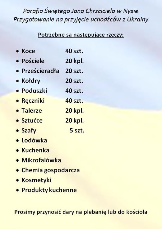 Parafia św. Jana Chrzciciela zbiera dary dla Ukraińców, którzy trafili do nas w schronieniu przed wojną. Co istotne – potrzebne są konkretne rzeczy jak koce, kołdry czy poduszki.