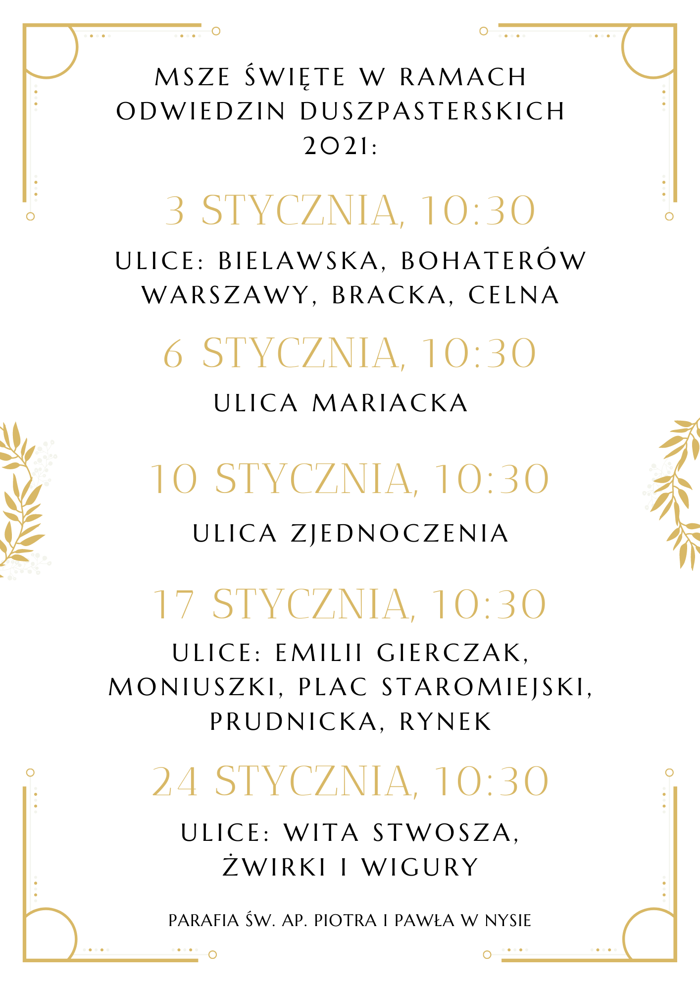 Uroczyste Sumy zaplanowano o godz. 10:30, sprawowane w ich intencji, ze specjalnym Błogosławieństwem Kolędowym dla Rodzin wraz z wystawieniem Najświętszego Sakramentu, według zaproponowanego poniżej harmonogramu – można oczywiście dołączyć do innego „regionu kolędowego” – informuje parafia św. Piotra i Pawła.