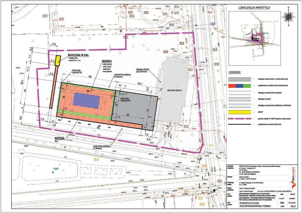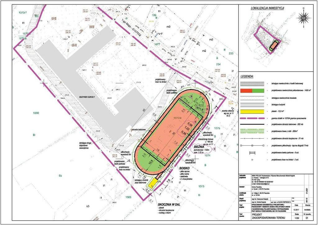 Do zadań wykonawcy w Zespole Szkolno- Przedszkolnym w Kamienicy będzie należało: demontaż istniejącej kanalizacji deszczowej i wyposażenia boiska, remont boiska sportowego z wykonaniem nawierzchni poliuretanowej, montaż wyposażenia boiska oraz małej architektury, budowa nowych i przebudowa istniejących przyłączy kanalizacji deszczowej. W Szkołach Podstawowych w Paczkowie zostanie wykonane: demontaż istniejącego wyposażenia boiska sportowego, remont boiska sportowego z wykonaniem nawierzchni poliuretanowej, montaż wyposażenia( do siatkówki, koszykówki, mini piłki nożnej/ręcznej), montaż małej architektury i piłkochwytów, wykonaniu bieżni, skoczni w dal oraz wykonanie odwodnienia.