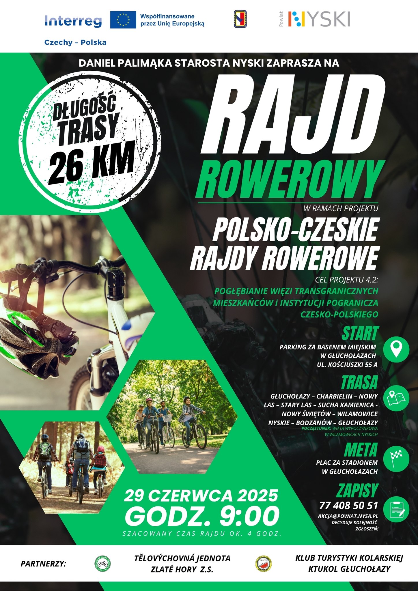 Daniel Palimąka Starosta Nyski serdecznie zaprasza na rajd rowerowy w ramach projektu “POLSKO-CZESKIE RAJDY ROWEROWE”. Tym razem trasa o długości 26 km powiedzie między innymi przez Głuchołazy.