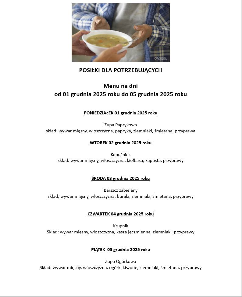 Poniżej CIS przedstawił menu na dni od: 01 grudnia 2025 r. do 05 grudnia 2025 r.w godzinach od 11.00 do 13.00, ul. Głuchołaska 8