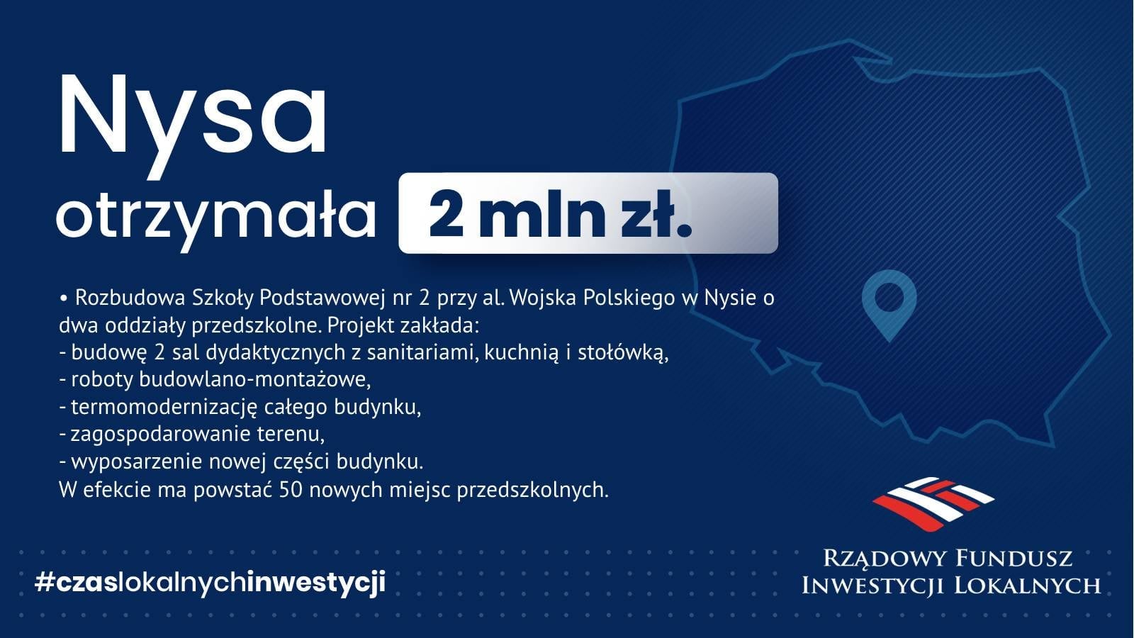 Do Gminy Nysa wpłynie 2 000 000 zł na rozbudowę Szkoły Podstawowej nr 2 przy Al. Wojska Polskiego w Nysie o dwa oddziały przedszkolne.