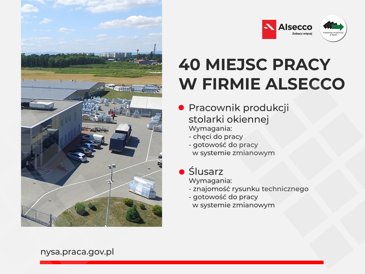 Powiatowy Urząd Pracy w Nysie prowadzi rekrutację dla firmy ALSECCO, która od zaraz zatrudni osoby zainteresowane podjęciem pracy na stanowisku pracownika produkcji stolarki okiennej oraz ślusarza.