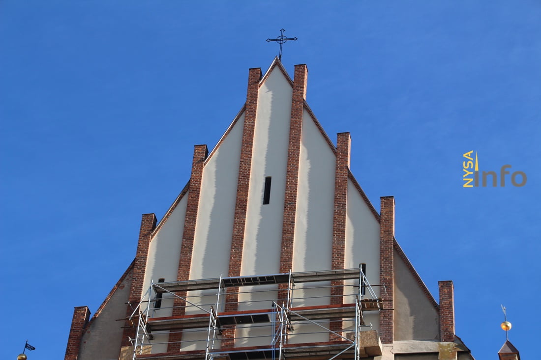 Dolna partia szczytu nyskiego kościoła pochodzi jeszcze z czasów budowy w XV wieku, natomiast wyższa część powstała podczas odbudowy w latach 50tych ubiegłego wieku.