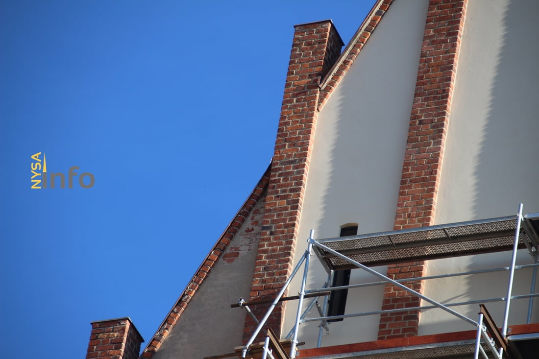 Założone zostały nowe, jasne tynki oraz wiatrowskazy. Ponadto wykonano również obróbki blacharskie, które mają zabezpieczyć szczyt przed wilgocią.