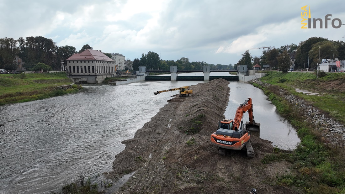 Dwa prowadzone obecnie zadania obejmują odcinek od budowli zrzutowej zbiornika Nysa w kierunku miejscowości Kubice. Docelowo roboty zrealizowane zostaną na długości ponad 65 km, do ujścia do rzeki Odry. Na zdjęciu widoczne jest usuwanie łachy, czyli nagromadzenia piaszczystego materiału niesionego wody wezbraniowe przy jazie powyżej mostu Bema w Nysie.