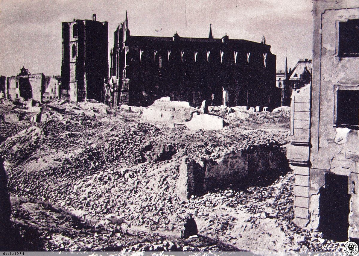 Po 1945 roku obraz kościoła św. Jakuba w dużym skrócie przedstawiał się następująco: spłonął dach, organy, wyposażenie kilku kaplic, ławki pod chórek, uszkodzone zostały niemal wszystkie okna oraz instalacje. Ponadto ogień strawił także dzwonnicę.