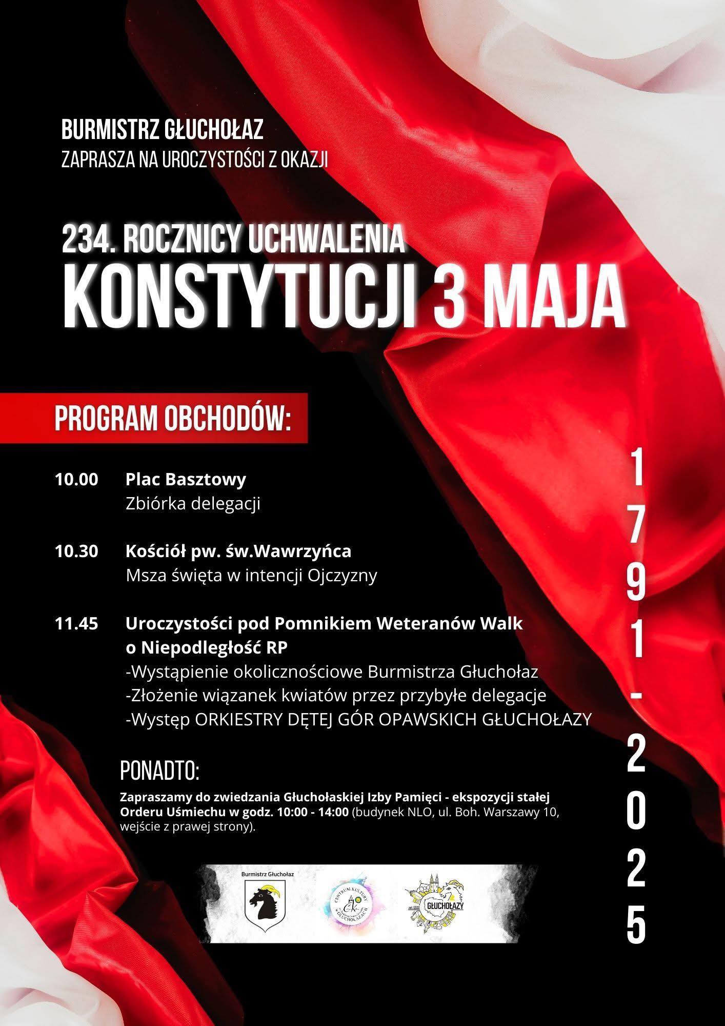 Zapraszam wszystkich mieszkańców gminy Głuchołazy oraz naszych gości zapraszam do udziału w obchodach 234. Rocznicy Uchwalenia Konstytucji Trzeciego Maja – pisze w mediach społecznościowych Paweł Szymkowicz Burmistrz Głuchołaz.