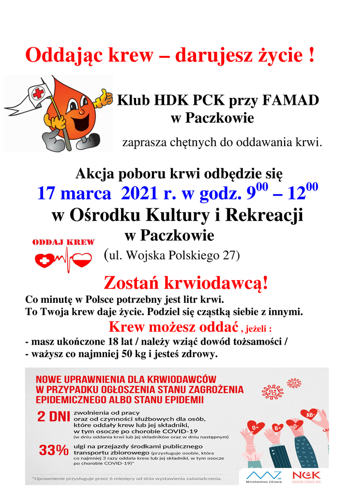 Kolejna akcja poboru będzie miała miejsce już 17 marca w godzinach od 9. do 12. w Ośrodku Kultury i Rekreacji w Paczkowie.