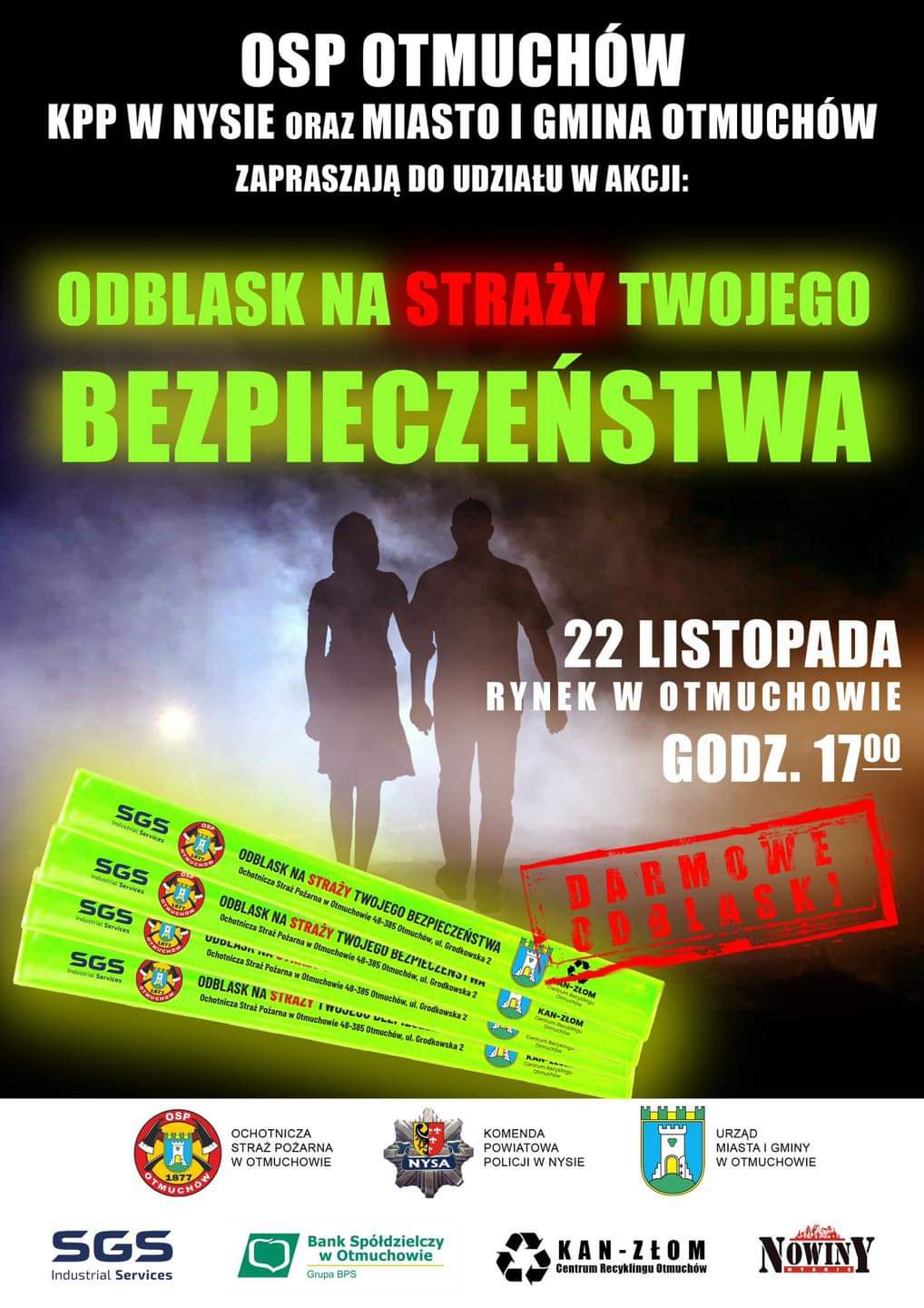 Miasto i Gmina Otmuchów, OSP Otmuchów oraz KPP w Nysie zapraszają wszystkich mieszkańców na akcję “Odblask na straży Twojego bezpieczeństwa”! 22 listopada Rynek w Otmuchowie Godz. 17:00 Czekają na Was darmowe odblaski – zadbajmy wspólnie o bezpieczeństwo na drogach!