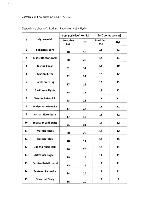 Zestawienie obejmuje obecności poszczególnych radnych Rady Miejskiej w Nysie na komisjach i sesjach od dnia zaprzysiężenia do dnia 19 lutego 2025 roku.